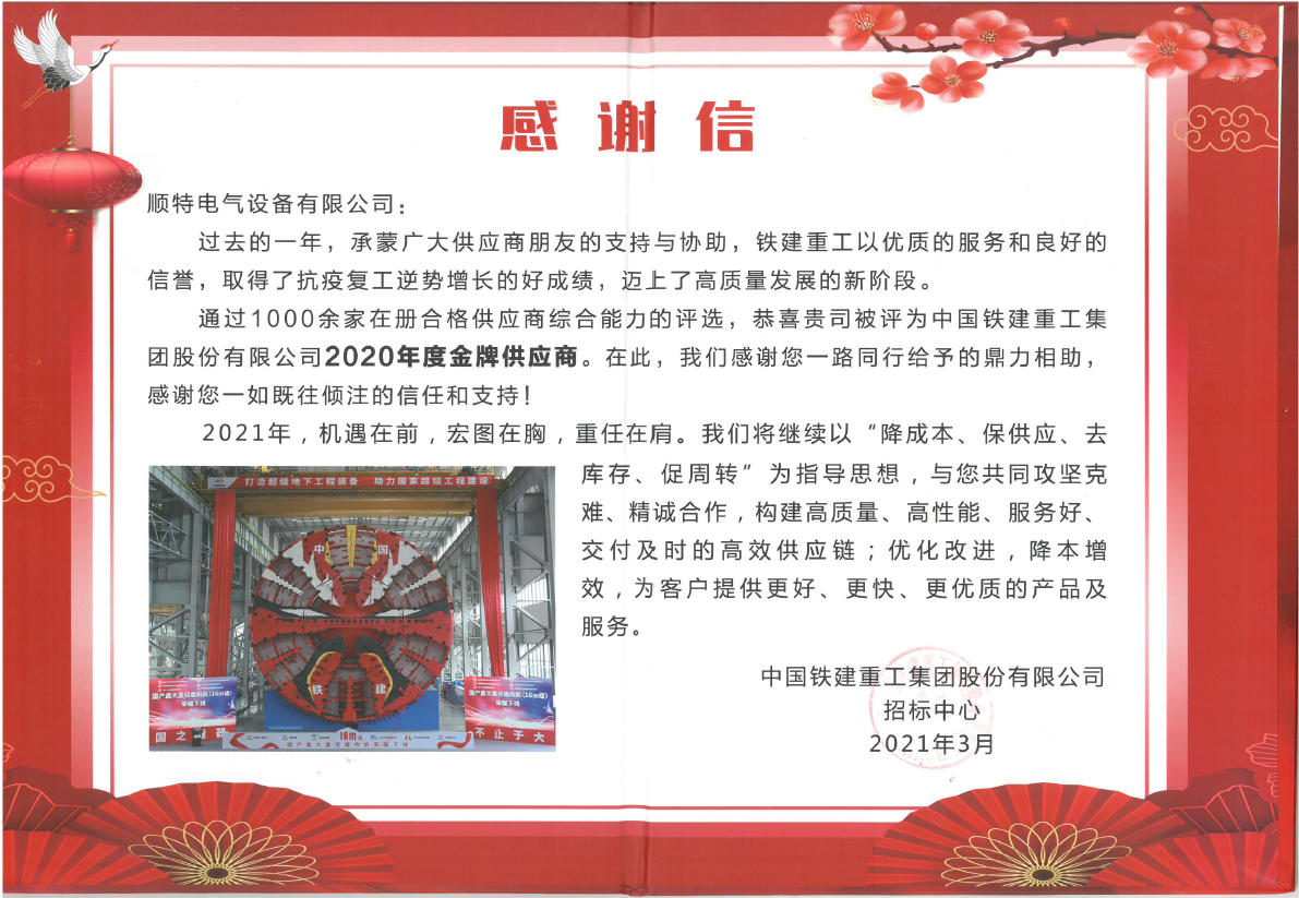 中國鐵建重工是順特電氣的重要戰(zhàn)略客戶,由最早的樣機(jī)開發(fā)到如今的標(biāo)準(zhǔn)機(jī)型及項目專業(yè)定制產(chǎn)品,雙方合作已長達(dá)10多年。2020年,疫情雖然給各行業(yè)帶來了影響,但我司砥礪前行、無懼困難,與中國鐵建重工共同努力,為客戶提供高效優(yōu)質(zhì)的產(chǎn)品和服務(wù),獲得了中國鐵建重工授予的“金牌供應(yīng)商”稱號。這一榮譽(yù)的獲得離不開中國鐵建重工對我司的信任和支持,體現(xiàn)了合作單位對我司產(chǎn)品與服務(wù)的充分肯定。