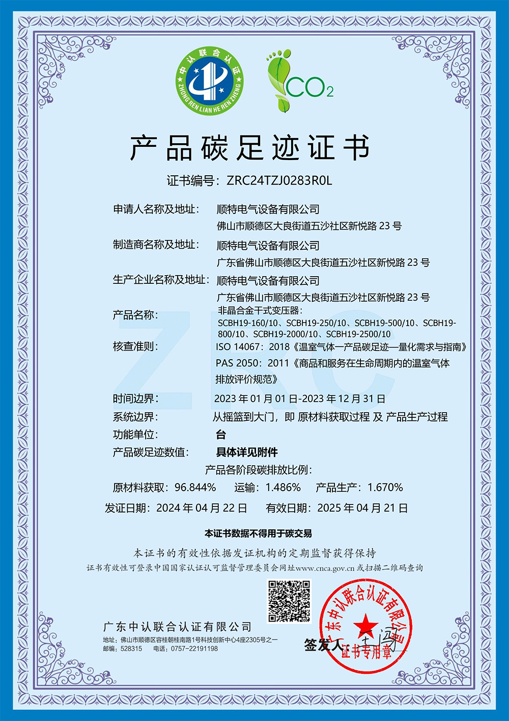 順特電氣設備有限公司取得產(chǎn)品碳足跡證書