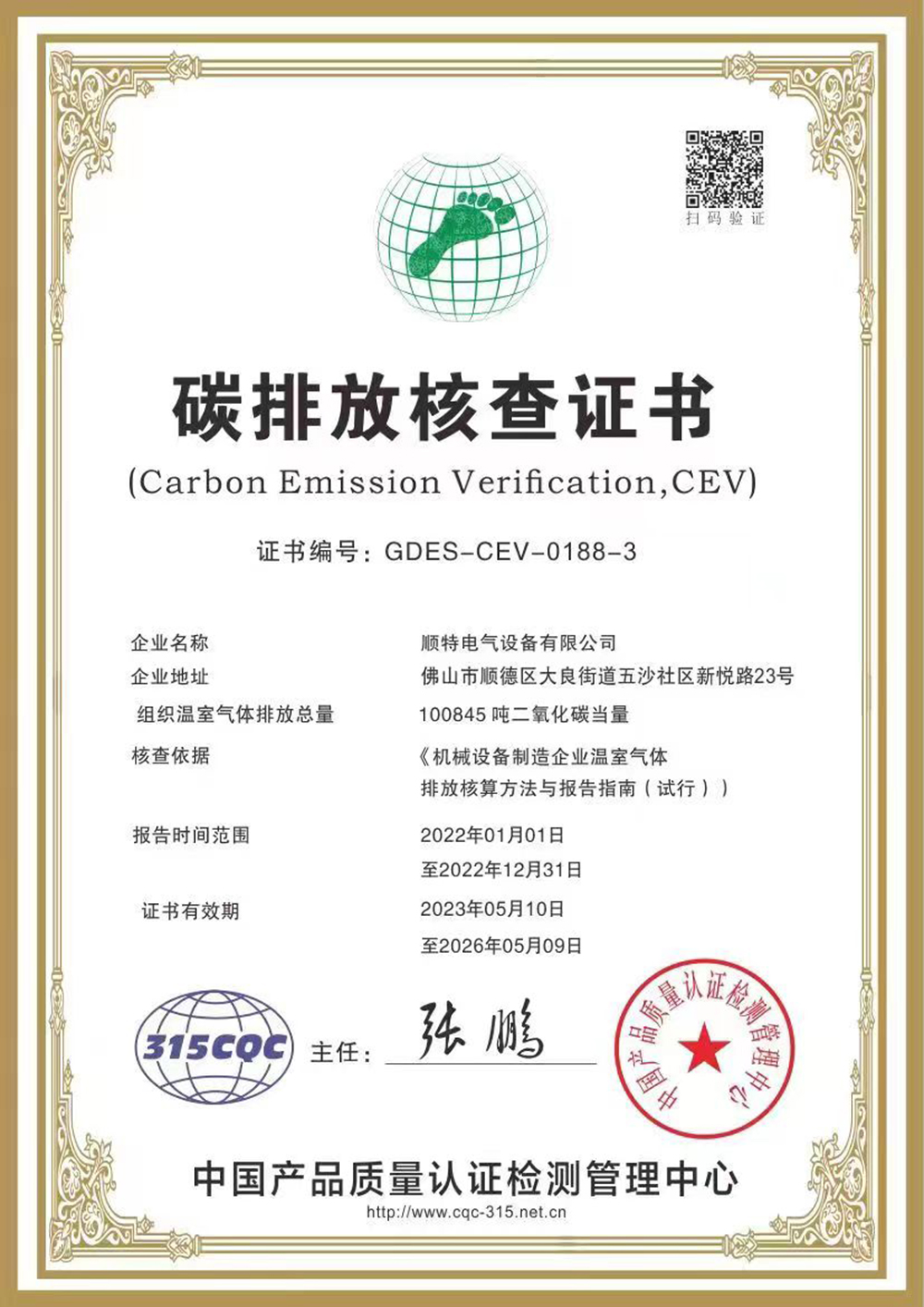 順特電氣設(shè)備有限公司取得碳排放核查證書